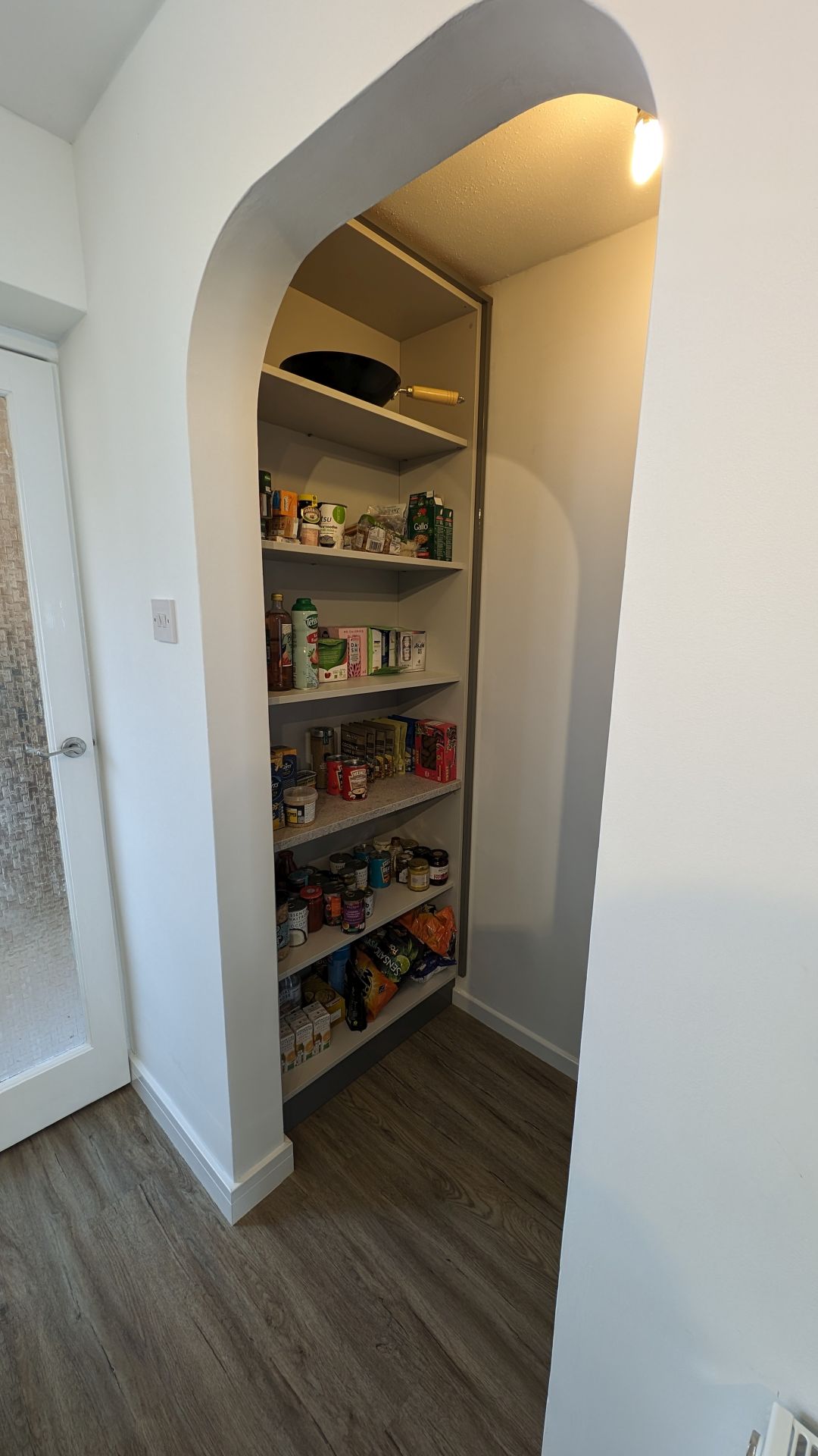 - Two bespoke open-shelf cabinets to form a pantry in an adjacent area under the stairs.