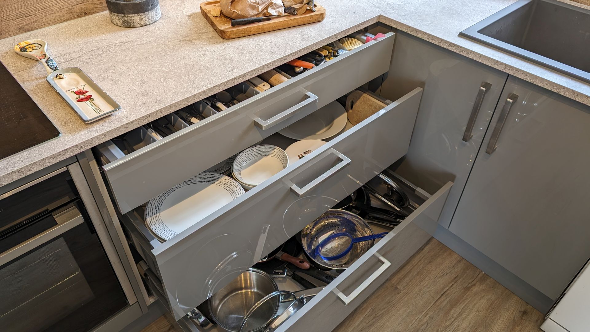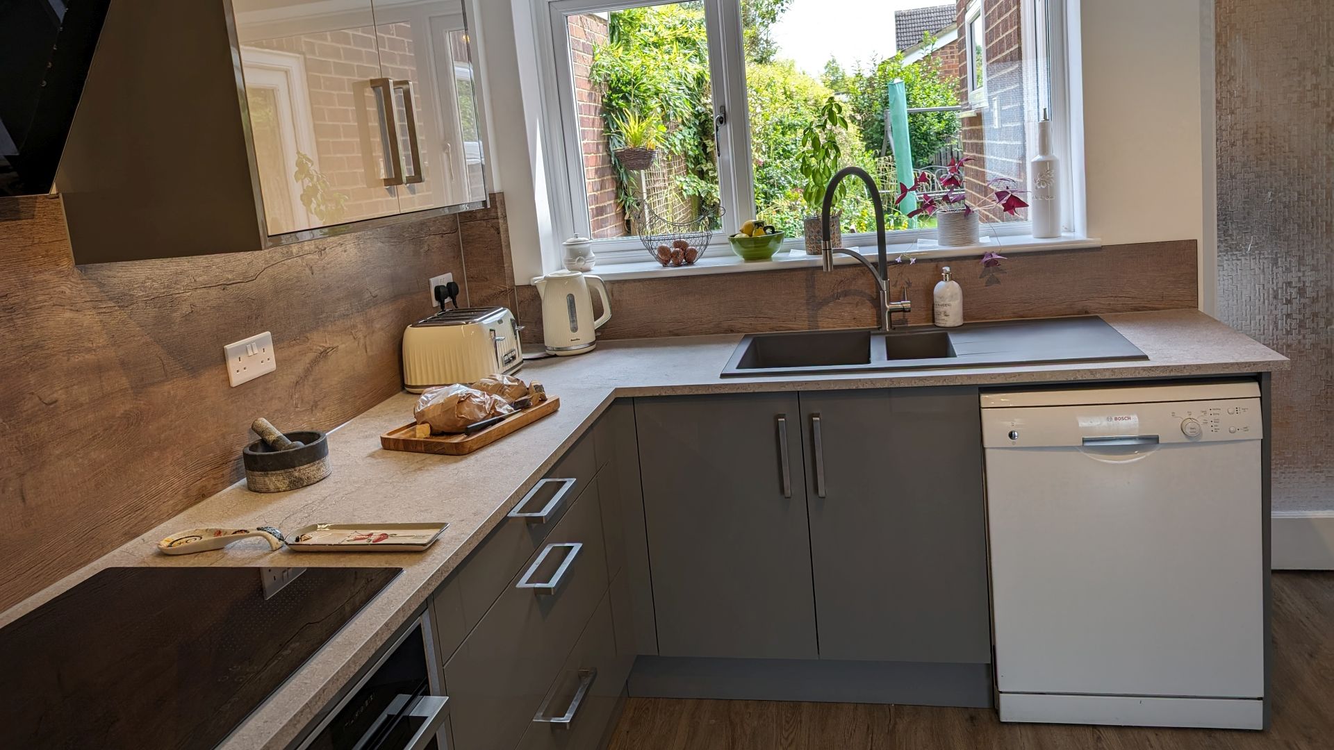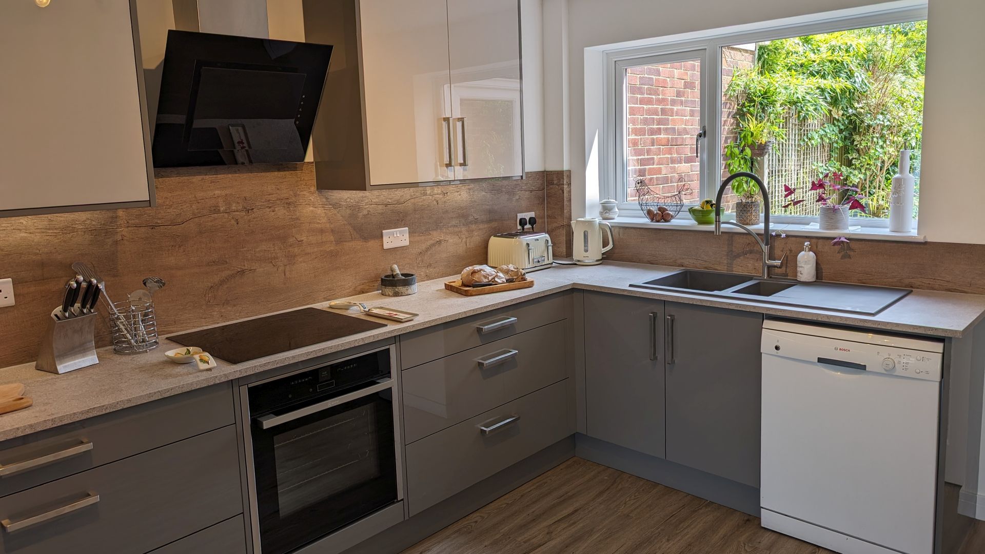 The client chose from our Lifestyle collection gloss dust grey cabinets, complemented by light grey wall cabinets framed with matching panels, pelmets, and cornices. Extra-deep 22mm square-edged laminate worktops in Calais Travertine added a light grey speckled finish, perfectly contrasting the gunmetal grey granite sink and matching tap. Warm oak-effect splashbacks and Camaro LVT flooring in “Quayside Oak” brought natural texture and warmth to the design.