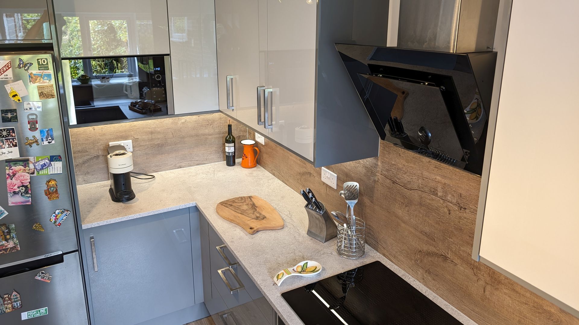 The completed kitchen blends functionality with elegance, offering smart storage solutions, durable finishes, and a welcoming atmosphere. The gloss cabinets, paired with oak-effect flooring and splashbacks, create a modern yet warm aesthetic. The kitchen is practical for everyday use while offering a sleek space for entertaining.